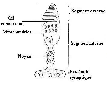 L'autre partie du photorécepteur est, nous l'avons déjà dit, son segment externe. Il est formé de l'empilement de plusieurs centaines de lamelles, elles-mêmes correspondant à des repliements de la membrane plasmique qui enveloppe le photorécepteur. C'est au niveau de cette partie du cône, le segment externe, que se produit l'interaction avec la lumière; les molécules impliquées, les iodopsines, sont présentes dans la membrane des lamelles.
