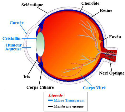 - Le cristallin : c'est la lentille de l'oeil qui permet la mise au point par sa propriété essentielle qu'est sa plasticité qui lui permet de focaliser la lumière sur la rétine en modifiant ses courbures lors de l'accommodation. De forme biconvexe, flexible et transparent, il est situé à l'intérieur du globe oculaire. Sa partie antérieure est en contact avec l'humeur aqueuse et sa partie postérieure avec le corps vitré. Il est maintenu en place par une série de fibres amarrées au corps ciliaire, la zonule de Zinn.