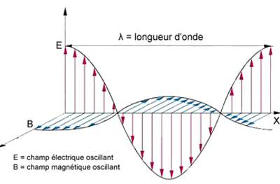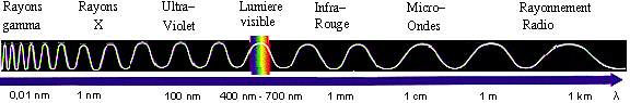 La lumière est d'un côté une onde électromagnétique, se propageant dans l'espace et le temps. En fait, nous baignons en permanence dans un champ électromagnétique, créé par la présence de particules chargées et leur déplacement. Une perturbation de ce champ se propagera: c'est une onde électromagnétique. Ceci donne à ces ondes la propriété de pouvoir se déplacer dans le vide, car même dans le vide il y a un champ électromagnétique. Les ondes électromagnétiques sont caractérisées par leur longueur d'onde, λ, trajet parcouru par l'onde pendant une période, et leur fréquence, ν. Ceux-ci sont liés par la formule , où c est la célérité de l'onde électromagnétique, soit environ 300 000 km.s-1, que l'on appelle aussi vitesse de la lumière dans le vide. Mais la lumière visible n'est en fait qu'une fenêtre étroite de l'ensemble des ondes électromagnétiques, qui comprennent les rayons gamma, X, ultraviolets, infrarouges, les ondes radios, etc. Le spectre du visible s'étend à peu près de 400 nm (violet) à 700 nm (rouge).