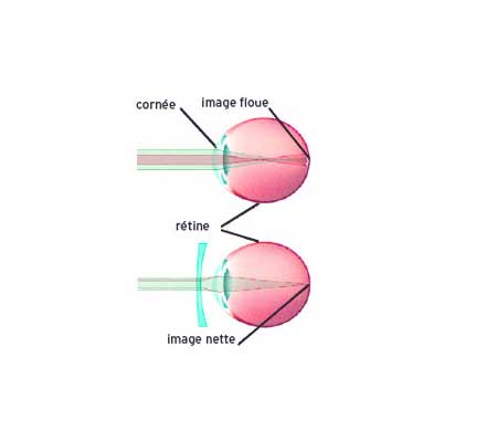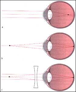 Fig a : œil myope, Fig b : oeil normal, Fig c : oeil myope corrigé par un verre concave