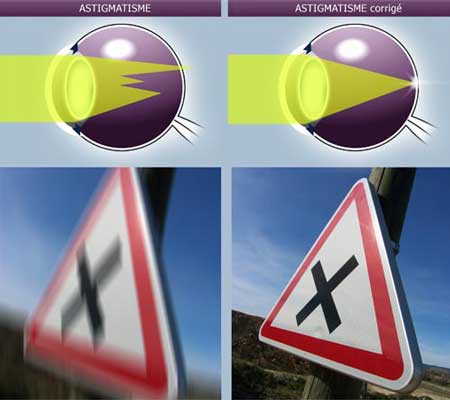 Il s’agit d’une amétropie qui est en rapport avec une déformation cornéenne généralement congénitale ou acquise. L’image est dédoublée au niveau de la rétine et ne se confondent pas. Le patient voit un peu floue ou ambré selon le degré de l’astigmatisme. Cette amétropie est corrigée par des verres cylindriques, lentille de contact torique souple ou rigide, incision relaxante ou Lasik.