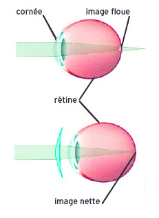 C’est une amétropie qui est dûe à une anomalie du développement du globe oculaire dont les dimensions sont plus grandes par rapport à la normale. Cette anomalie fait que l’image de l’objet se forme en avant de la rétine. Donc, la personne voie floue de loin et très bien de prés. Ce vis de réfraction fait que la presbytie arrive tard chez ces patients ou pas du tout. En cas de forte myopie (> 6D), la distension du globe expose la rétine à développer des zones de faiblesses qui peuvent se déchirer puis la rétine à se décoller d’où la nécessiter de surveiller le fond de l’œil de tous les forts myopes une à deux fois par an. La myopie est souvent associée au glaucome à angle ouvert d’où la nécessité d’une surveillance systématique du tonus oculaire à chaque consultation. Cette amétropie est corrigée par des verres concaves, des lentilles de contact, par Lasik ou en cas de forte myopie par implantation d’implant phaque en chambre antérieure ou postérieure ou chirurgie du cristallin clair.
